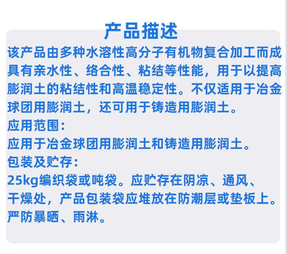 產(chǎn)品介紹:該產(chǎn)品由多種水溶性高分子有機物復合加工而成。具有親水性、絡合性、粘結(jié)等性能,用于以提高膨潤土的粘結(jié)性和高溫穩(wěn)定性。不僅適用于冶金球團用膨潤土,還可用于鑄造用膨潤土。應用范圍:應用于冶金球團用膨潤土和鑄造用膨潤土。包裝及貯存:25kg編織袋或噸袋?!?/p>