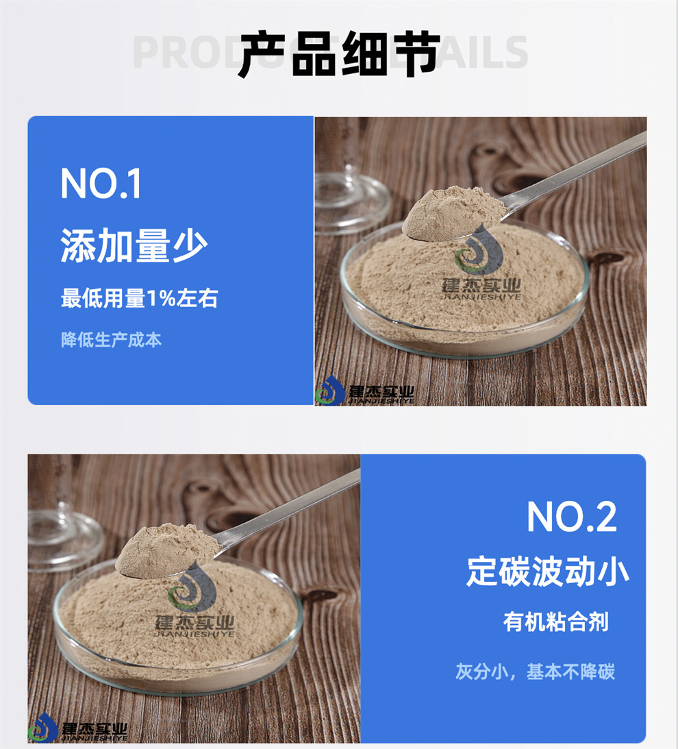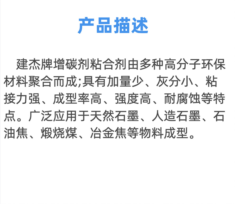 產(chǎn)品介紹:建杰牌增碳劑粘合劑由多種高分子環(huán)保材料聚合而成;具有加量少、灰分小、粘接力強(qiáng)、成型率高、強(qiáng)度高、耐腐蝕等特點(diǎn)。廣泛應(yīng)用于天然石墨、人造石墨、石油焦、煅燒煤、冶金焦等物料成型。產(chǎn)品特點(diǎn):1.添加量少:*低用量1%左右,降低生產(chǎn)成本。2.固定碳波動(dòng)小:有……